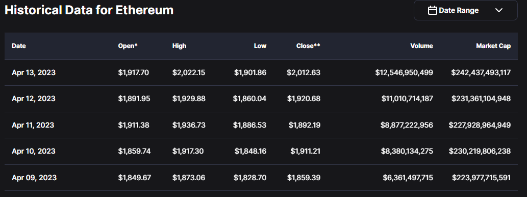 Kandil harian ETH ditutup pada level $2.012, dengan harga tertinggi berada pada level $2.023, dan harga terendah berada pada level $1.899.