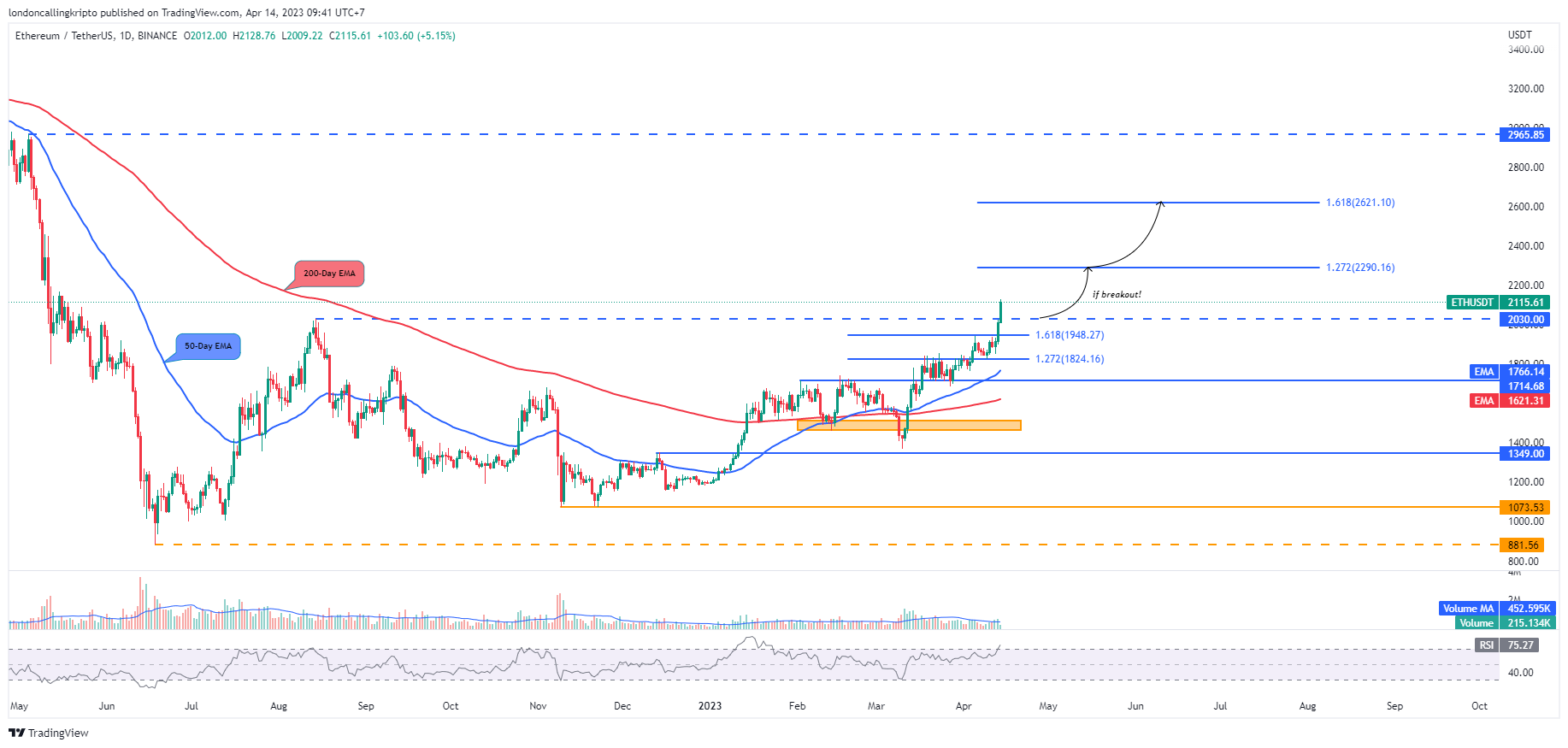 Pergerakan harga ETH berhasil breakout resistance yang merupakan ratio 1.681 fibonacci retracement pada level $1.948 yang menjadi sinyal positif untuk pergerakan harga ETH kedepannya.