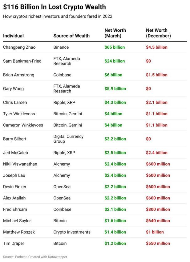 Penurunan jumlah kekayaan yang paling menonjol dialami oleh pendiri dan ex CEO exchange FTX, Sam Bankman-Fried. Pada awal tahun, kekayaan SBF bernilai sekitar $24 miliar. Sementara FTX baru saja mendapatkan pendanaan $400 juta yang bernilai $32 miliar.