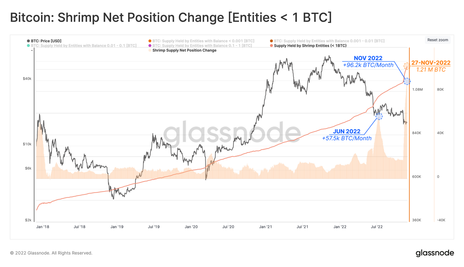 Sejak FTX ambruk, shrimp bahkan telah mengumpulkan 96.200 BTC. Shrimp saat ini telah memegang total 1,21 juta BTC.