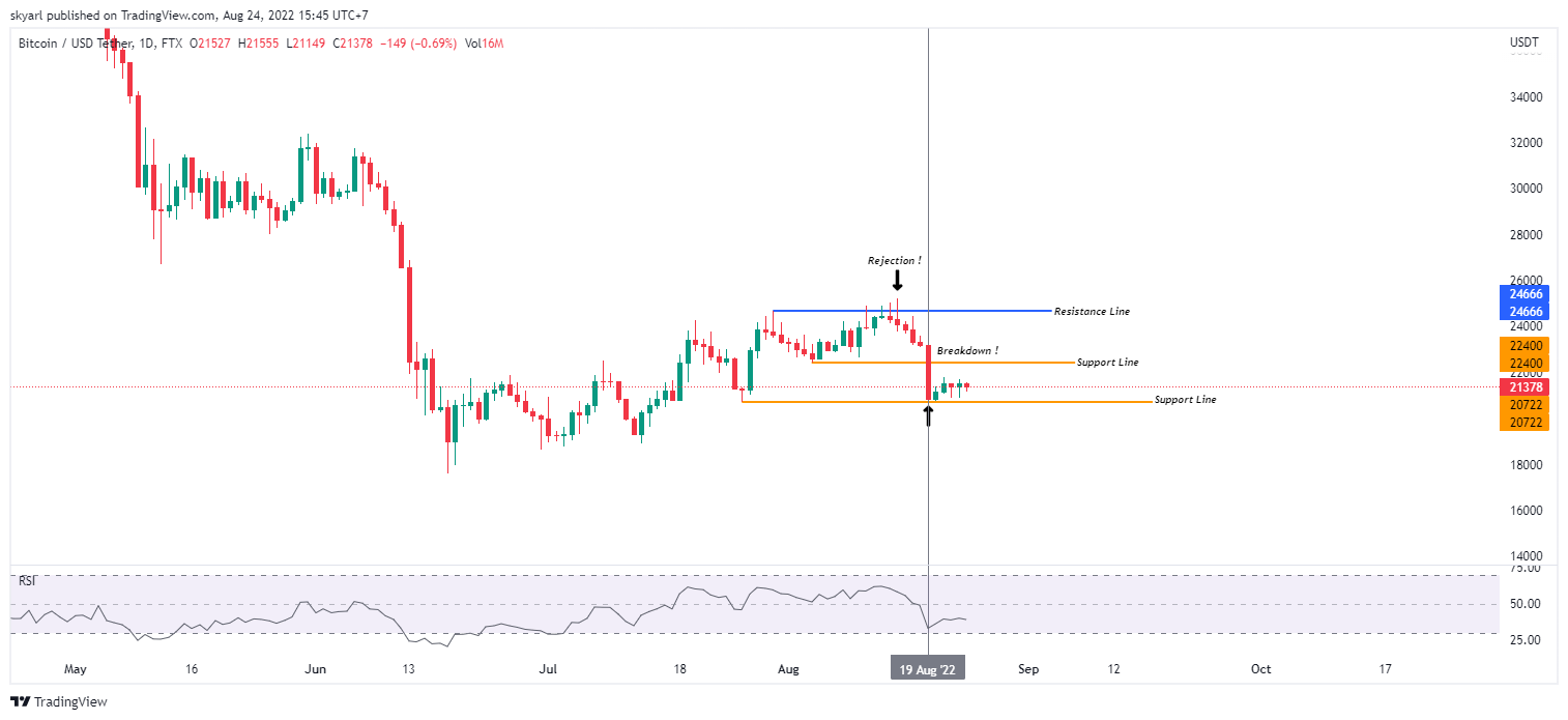 Pada 14 Agustus kandil harian Bitcoin ditutup merah, dan hal tersebut berlangsung selama enam hari beruntun. Puncaknya pada tanggal 19 Agustus pada saat support di level $22.400 berhasil ditembus dan bergerak turun hingga tertahan support selanjutnya pada level $20.722.