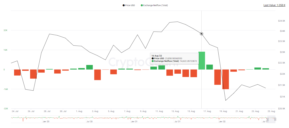 Hal tersebut menjadi pertanda buruk, karena kondisi tersebut mengindikasikan akan adanya aksi jual secara masif terhadap Bitcoin. Pada tanggal 18-19 Agustus, terlihat Bitcoin exchange netflow ditutup negatif dengan penutupan yang cukup tinggi, yang berarti adanya perpindahan Bitcoin dari wallet exchange ke wallet diluar exchange.