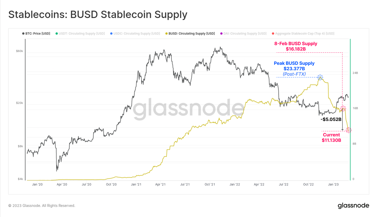 Menurut data platform analitik Glassnode, pasokan BUSD tercatat mencapai puncaknya sebesar $23,377 miliar pada November 2022, tepat sebelum exchange kripto FTX bangkut. Saat ini pasokan BUSD tercatat berada di angka $10,16 miliar.