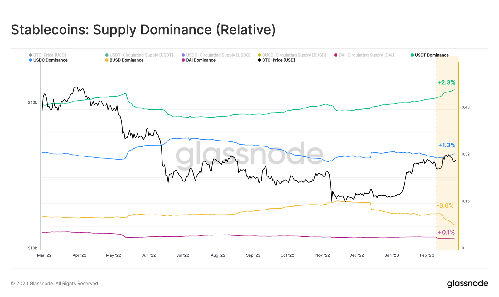 Sebelum ada ‘penjegalan’ dan NYSDFC dan Komisi Sekuritas dan Bursa (SEC), dominasi BUSD di pasar stablecoin cukup besar, mencapai 11%. Setelah pasokan BUSD terus turun, Tether (USDT) semakin merajai pangsa pasar stablecoin dengan dominasi hingga 54%.