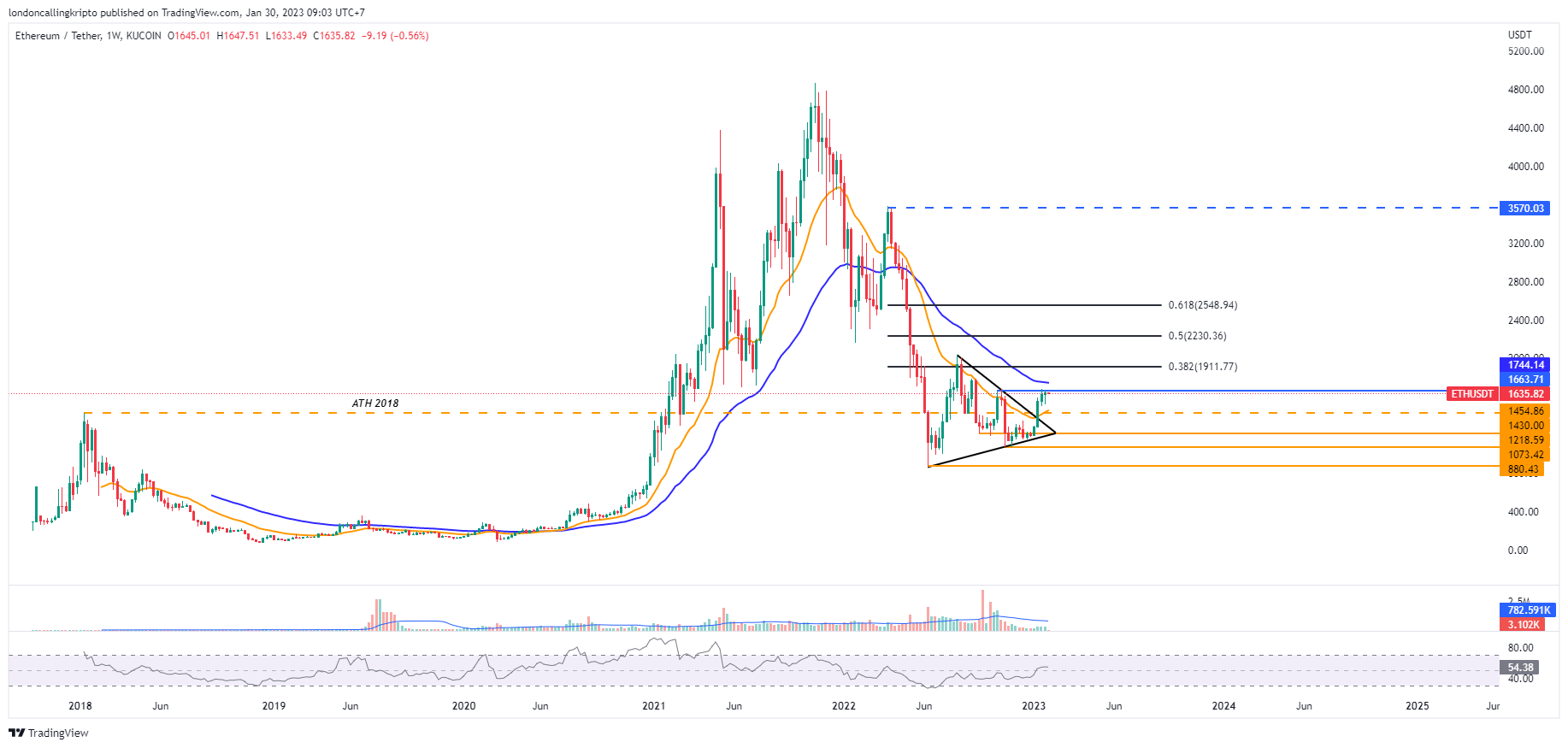 Dinamis resistance pada 50-week EMA di level $1.744 menjadi target naik terdekat apabila pergerakan harga ETH bebrhasil breakout.