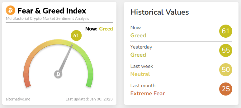 Kondisi bullish pasar kripto mendorong kepercayaan diri pelaku pasar. Fear and greed index menginjak level greed, dan berhasil menyentuh titik tertinggi pada bulan Maret 2022 di level 61.