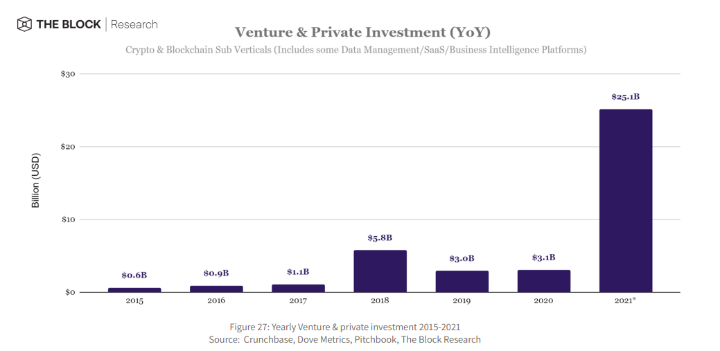Hal tersebut dikemukakan dalam Laporan Outlook Aset Digital 2022 The Block Research. Laporan tersebut menunjukan dibandingkan tahun sebelumnya, kesepakatan venture capital dengan perusahaan kripto meningkat 126% dan 719% peningkatan dalam hal pendanaan.