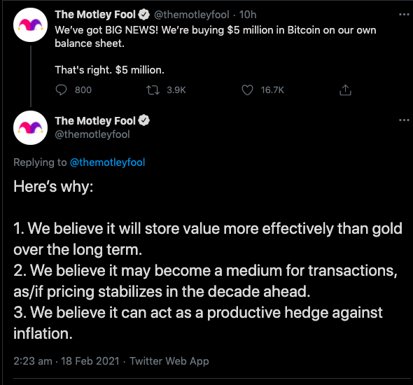 The Motley Fool mengumumkan keputusan tersebut melalui akun Twitternya. Sebelumnya, perusahaan tersebut pun sudah menunjukan ketertarikan berinvestasi di aset kripto. Pihak perusahaan, seperti dikutip dari Cointelegraph, menilai aset Bitcoin merupakan instrumen yang menjanjikan dalam investasi jangka Panjang. Selain itu, perusahaan ini menilai berinvestasi di Bitcoin bisa lebih menguntungkan ketimbang membeli emas.