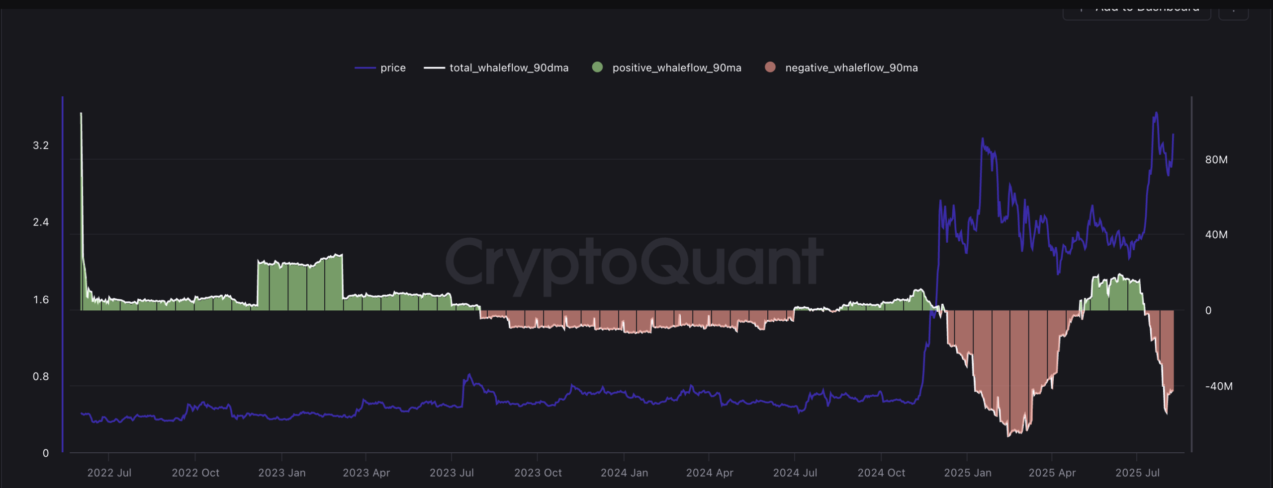 Meski tidak semua arus keluar berarti penjualan langsung (beberapa kemungkinan adalah perpindahan internal), pola historis menunjukkan hubungan terbalik: saat arus masuk whale meningkat, harga cenderung turun, dan sebaliknya.