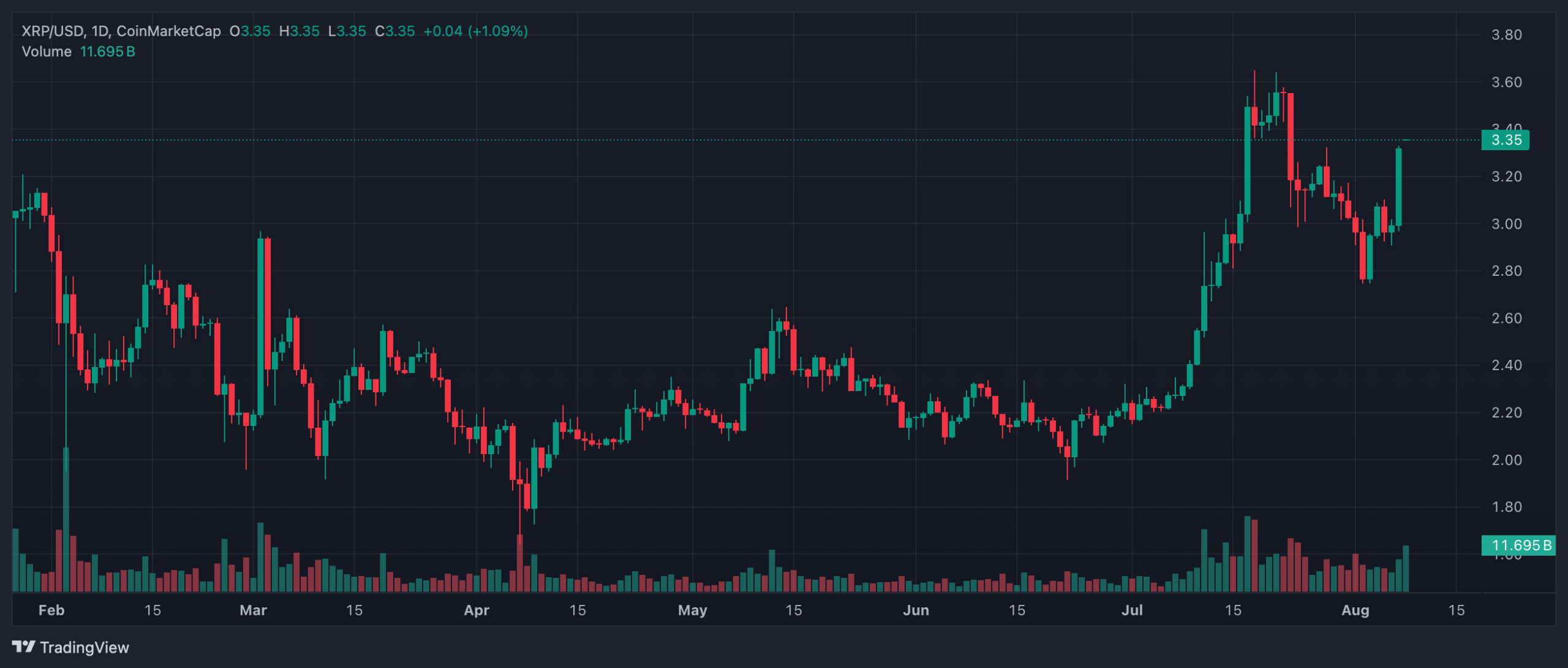 Saat ini harga XRP masih berada di level $3,35 setelah mengalmai kenaikan lebih dari 10% dalam 24 jam terakhir. Harga XRP mengalami lonjakan seiring dengan kenaikan sejumlah altcoin lainnya.