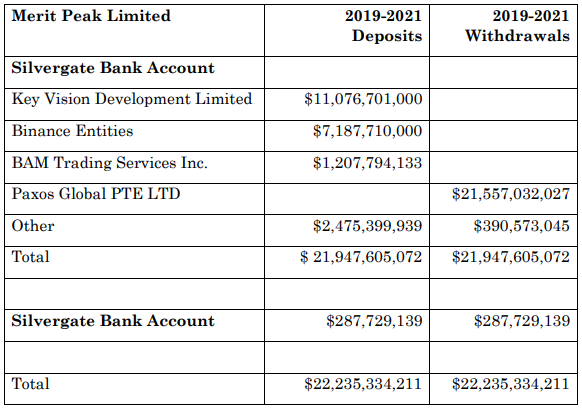 Dengan alamat email Solutions@Binance.com, rekening Merit Peak tercatat menerima $22,2 miliar dalam kurun waktu 2019 hingga 2021. Dari dana itu, $21,9 miliar di antaranya ditransfer ke Paxos, perusahaan penerbit stablecoin Binance USD (BUSD).