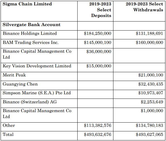 Perusahaan lain yang disinggung oleh SEC dalam dokumen pengadilannya adalah Sigma Chain, yang disebut milik CZ. SEC mengungkapkan, Sigma Chain telah menerima dana dari Binance dan BAM Trading Services masing-masing $184 juta dan $145 juta pada 2019-2023.