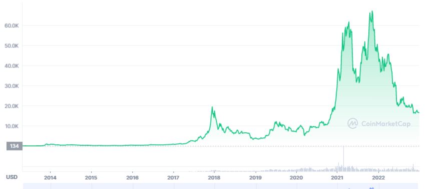 Grafik harga Bitcoin sejak tercatat di pertengahan tahun 2013 (Sumber: CoinMarketCap)