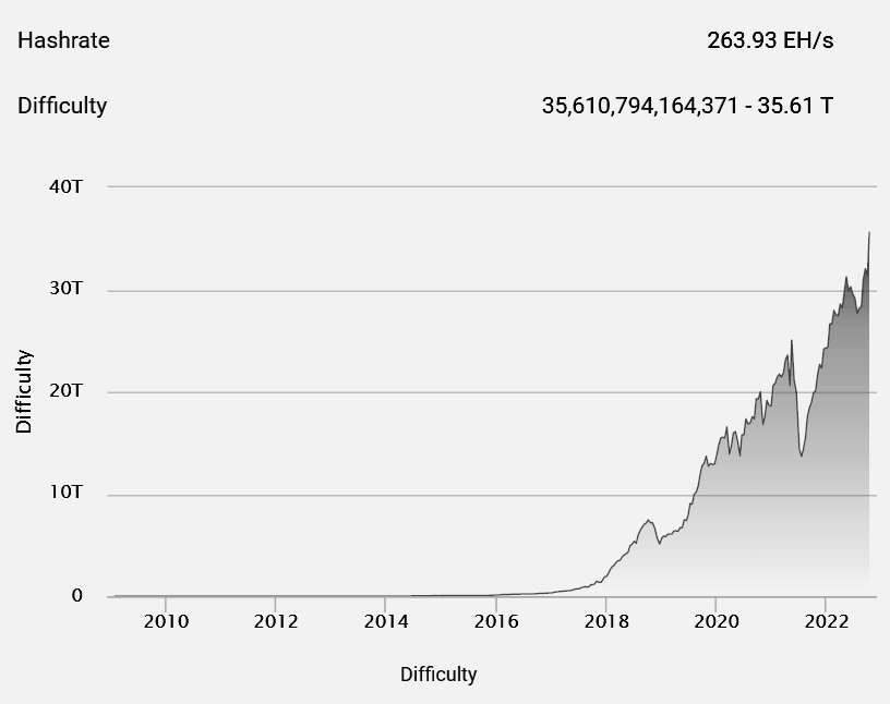 Pada Senin, 10 Oktober 2022, mining difficulty Bitcoin naik hingga 14% ke 35,6 triliun. Mining difficulty adalah tingkat kesulitan yang menghitung berapa hash yang dibutuhkan penambang untuk memproduksi string kriptografi agar bisa menambahkan blok baru ke rantai.