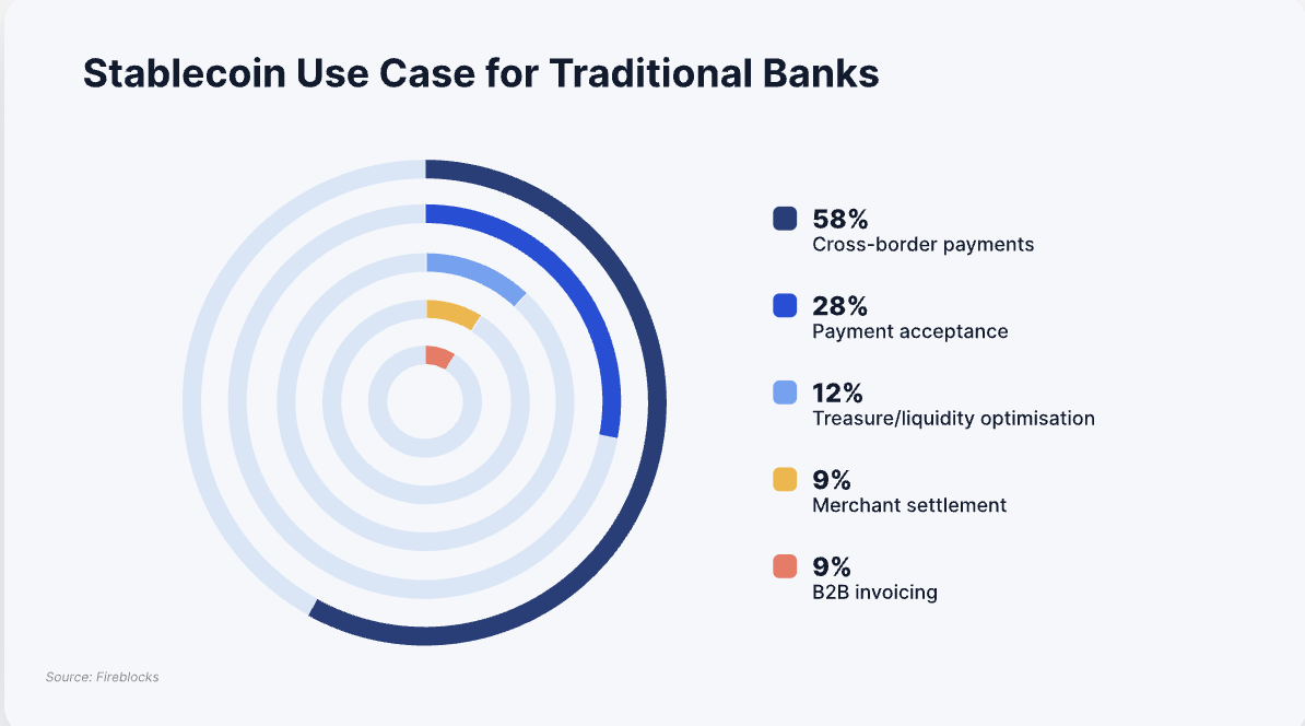 Fireblocks menyatakan bahwa banyak bank melihat stablecoin sebagai jalan menuju modernisasi, terutama karena sifatnya yang terkait nilai fiat (fiat-pegged), sehingga lebih mudah diintegrasikan ke dalam sistem keuangan yang sudah ada.