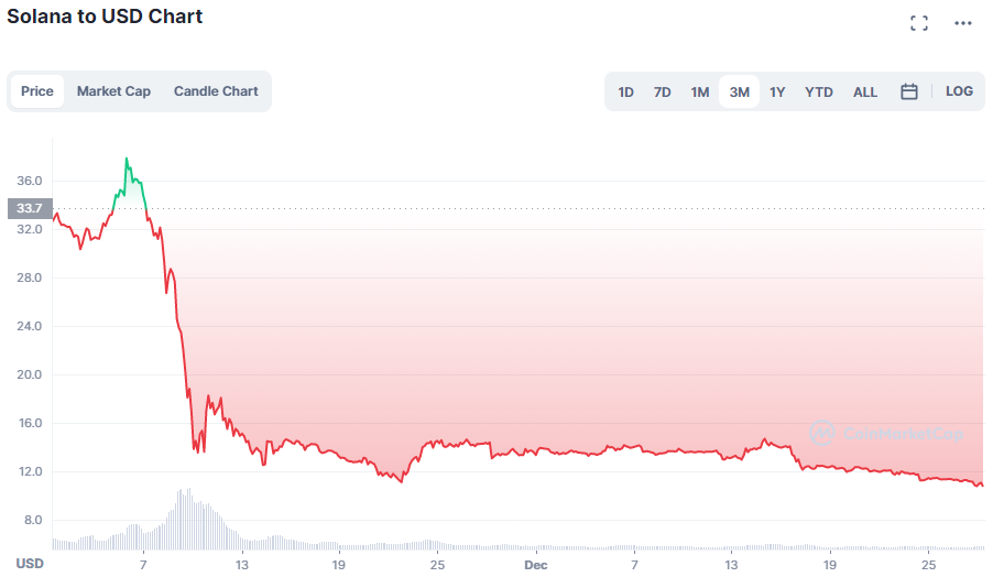 Pergerakan harga Solana sejak awal November 2022. (sumber: CoinMarketCap)