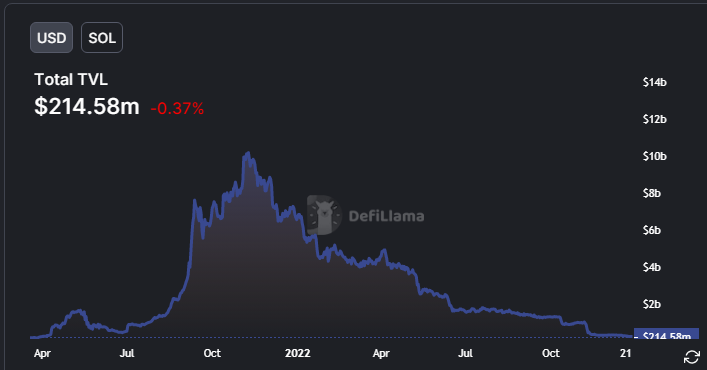 Total Value Locked (TVL) di seluruh ekosistem Solana juga sudah turun hingga 97,88% dari puncaknya di $10,17 miliar pada 9 November 2021. Menurut DefiLlama, saat artikel ini ditulis, TVL Solana hanya $214,58 juta.