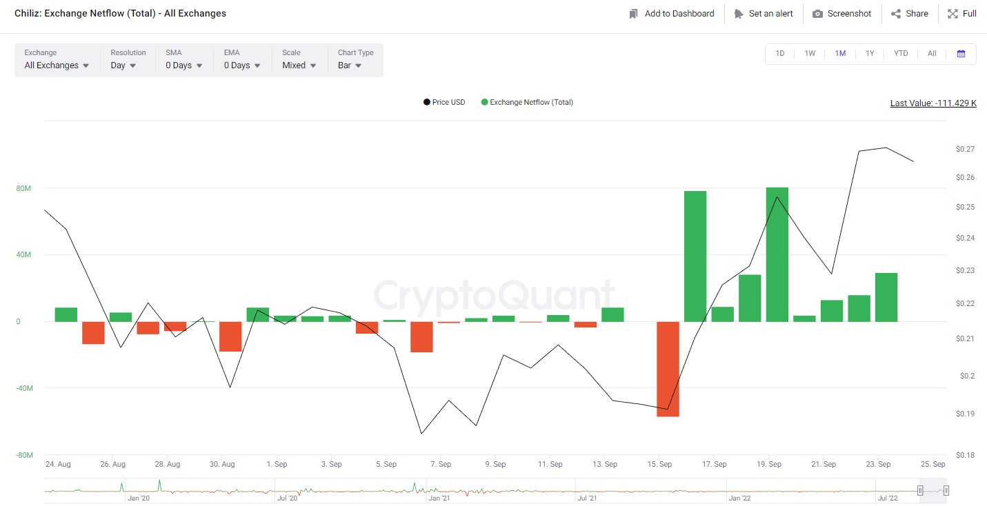 Arus Masuk (inflow) CHZ pada pertengahan September terlihat sangat tinggi. Bahkan exchange netflow (netflow = inflow-outflow) konsisten ditutup positif pada periode 16-23 September yang berarti para trader atau investor lebih banyak mengirim CHZ ke exchange daripada menarik aset tersebut keluar dari exhcange.