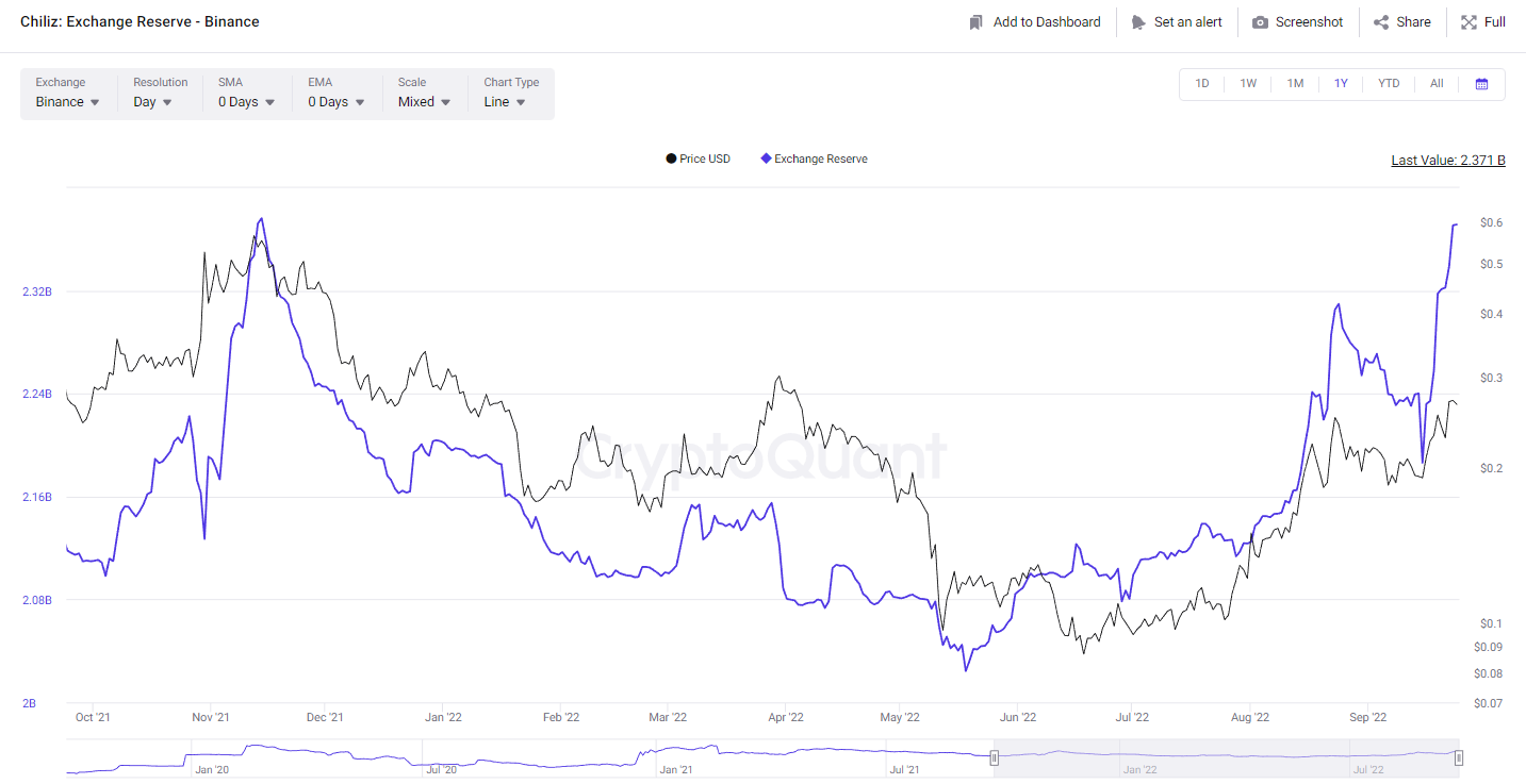Exchange reserve CHZ naik 8,45% pada periode 15-23 September. Pada 15 September exchange reserve CHZ di Binance sebanyak 2.186.108.927 CHZ dan jumlah tersebut terus bertambah hingga pada 23 September, total excahnge reserve CHZ di Binance berada pada level 2.370.784.782.