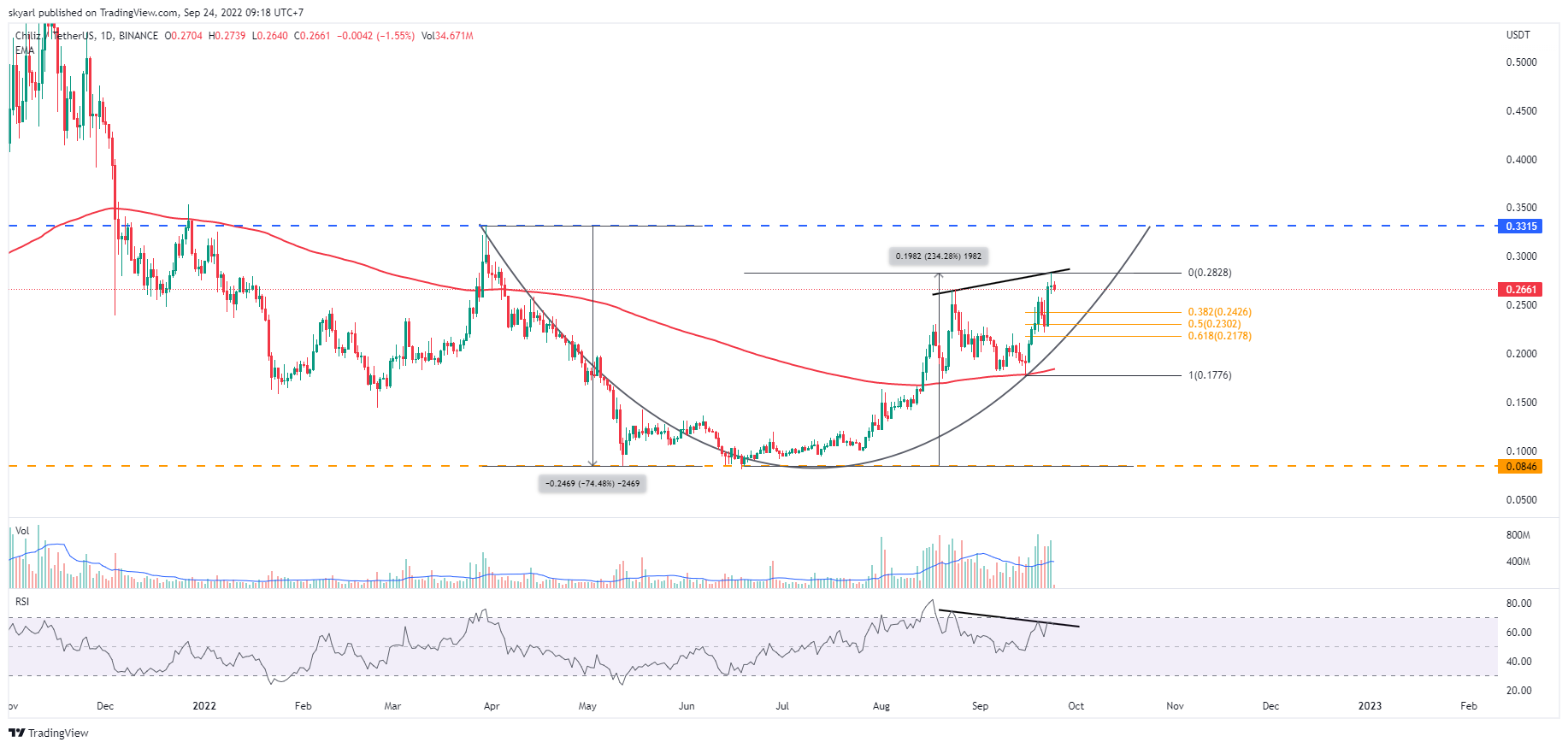 Jika bearish divergence tersebut valid, kemungkinan harga CHZ akan koreksi dengan target penurunan berada pada level $0,02426-$0,02178.