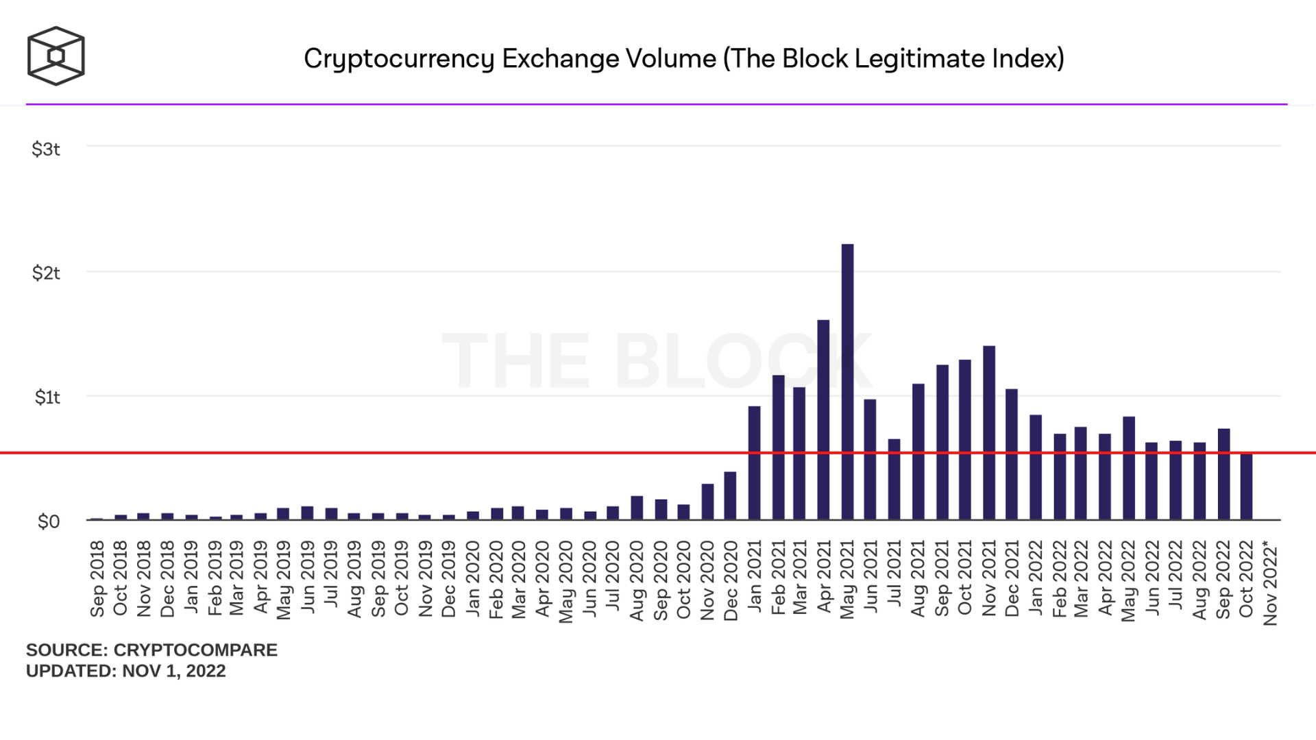 Berdasarkan wilayah, pasar pertukaran Asia mencatatkan tingkat penggunaan paling aktif. Volume perdagangan di exchange Asia turun menjadi $529 miliar pada Oktober, atau terendah sejak Desember 2020.
